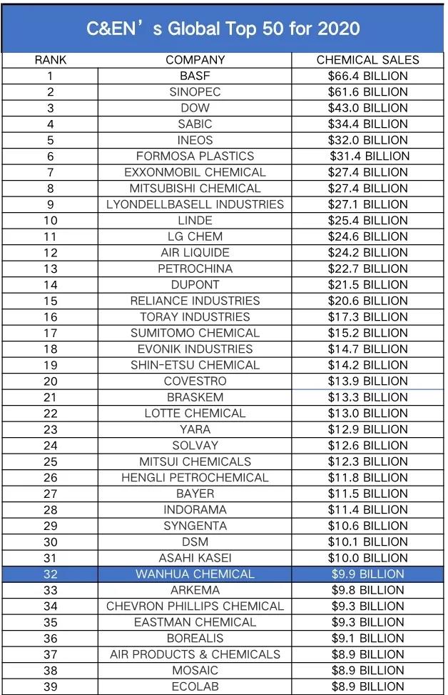 7月27日,美国《化学与工程新闻》(C&EN)发布2020年全球化工企业50强名单。万华化学以99亿美元再次进入榜单,较去年上升5位,位居32位。