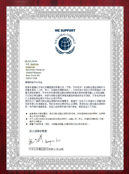 2019年8月30日,万华化学正式加入联合国全球契约,万华化学总裁寇光武代表万华郑重承诺支持联合国全球契约十项基本原则,这是万华向全社会展示可持续发展理念和企业社会责任的重要举措。