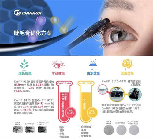 届时万华化学将展示在提升防晒霜SPF值、无暇丰盈效果睫毛膏、水性甲油等方面的全新解决方案,欢迎莅临展区垂询。