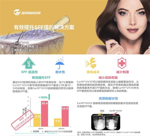 春天到了,紫外线也越来越强烈,万华化学带来全新的防晒霜解决方案,可以在有效提升SPF值的同时提供清爽的肤感,又能长效防晒减少刺激,让你不惧阳光,尽情的到户外感受春日暖阳吧~
