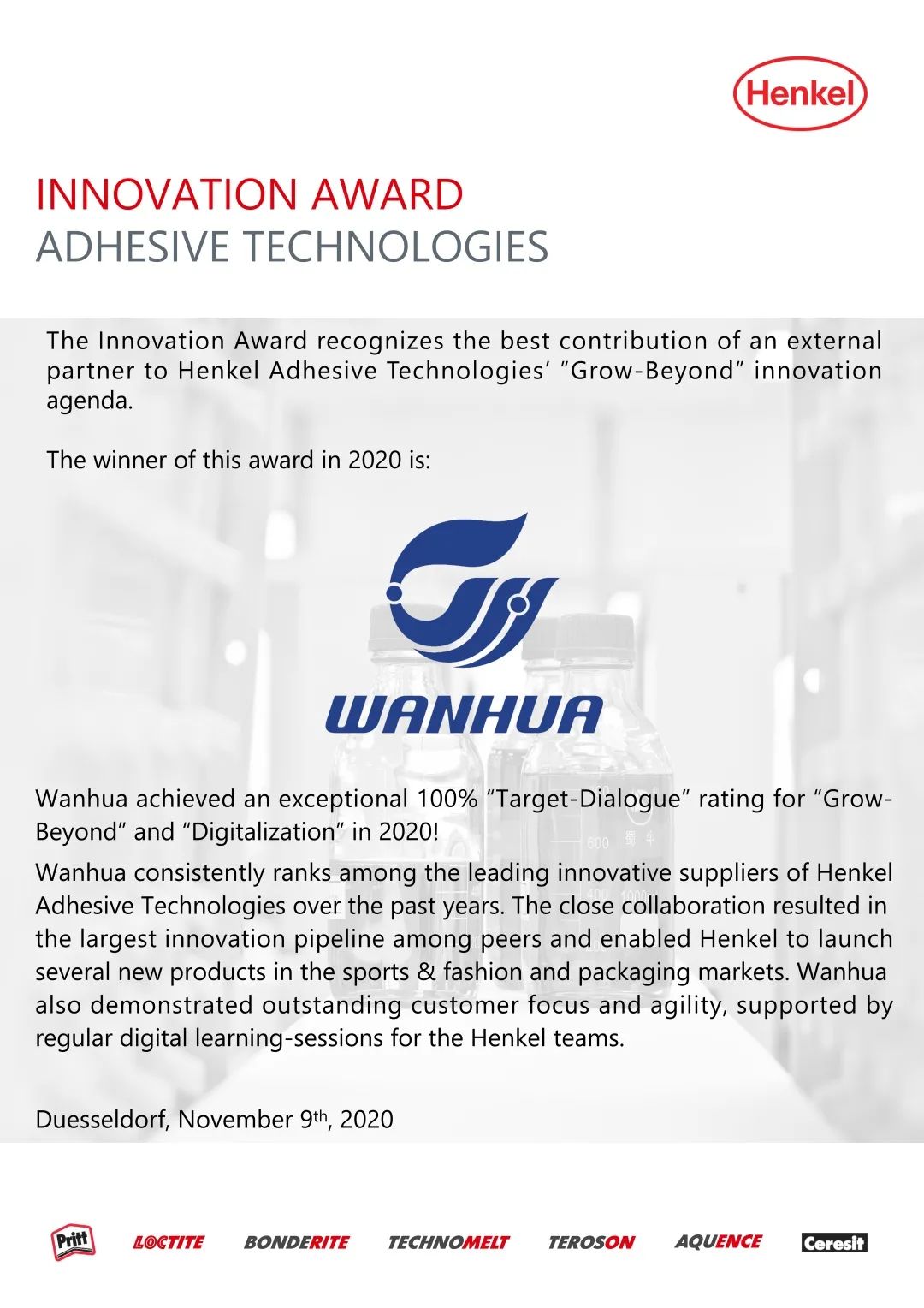 2020年11月10日,多宝多宝首页(以下简称万华化学)荣获汉高粘合剂技术2020全球最具创新供应商,该奖项充分肯定了万华化学在创新方面的出色表现。
