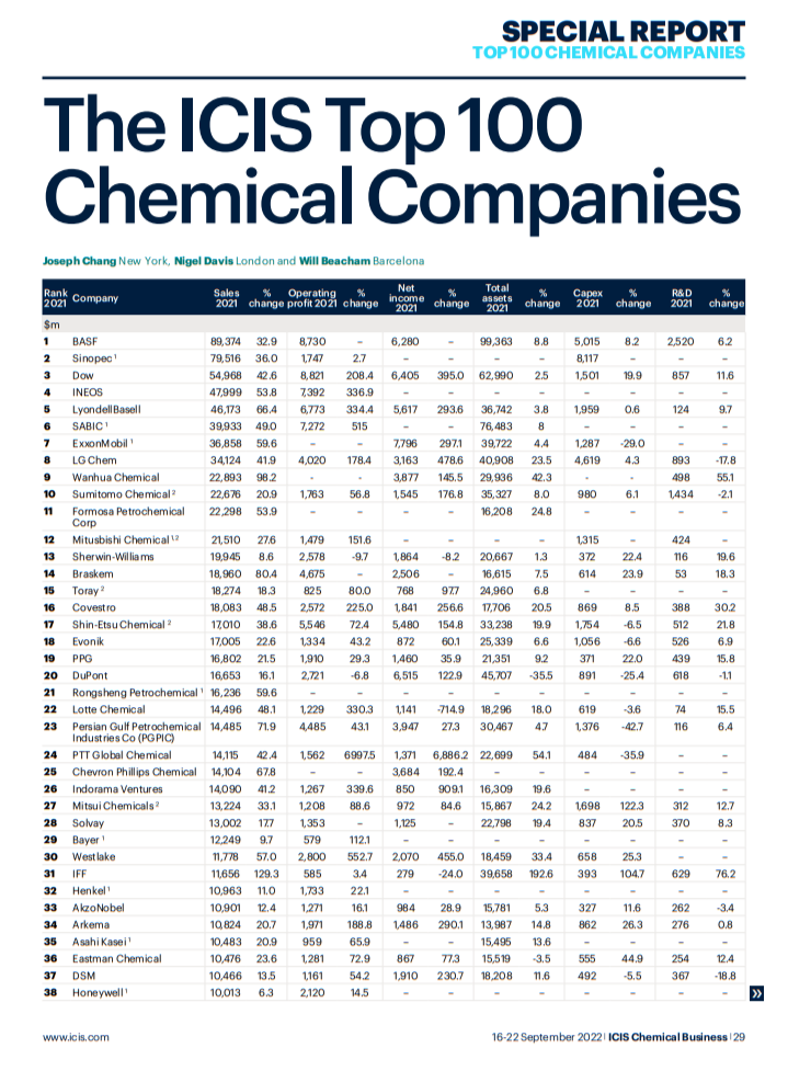 近期,ICIS发布最新世界化工企业100强排行榜(Top 100 Chemical Companies),对全球范围内主要化工企业进行了排名。万华化学凭借2021年1455亿人民币销售额位列榜单第九位。