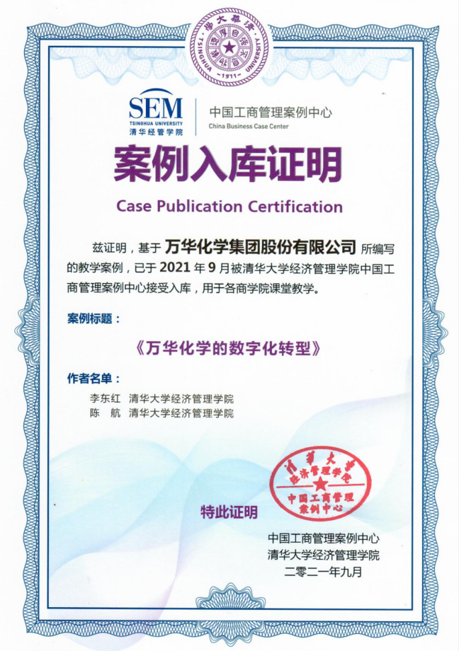 万华化学数字化建设以“创造价值、引领创新,成为国际一流的化工数字化使能者”为愿景,在“业务驱动、价值导向、整体规划、分步实施、用户满意”工作理念指导下,多年来一直致力于建设全链接、全数据的智慧企业,已经建成经营管理、智能制造、协同办公、生态圈协作、智慧决策和基础设施六大平台。2021年,《万华化学的数字化转型》案例被收入清华大学MBA案例库,用于各商学院课堂教学。