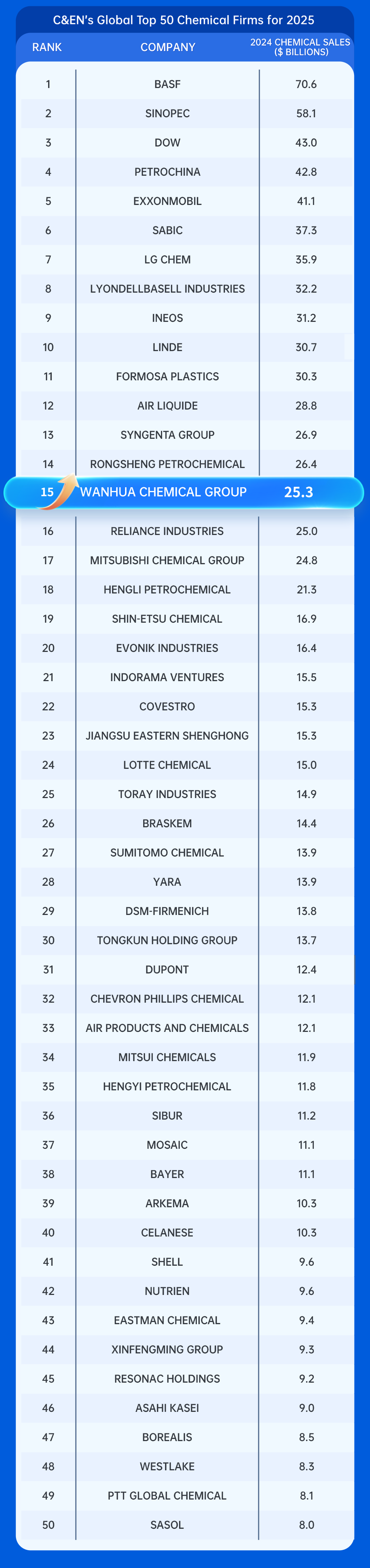 7月23日,C&EN(《化学与工程新闻》)发布最新全球化工企业50强排行榜(Global Top 50 Chemical Firms),对全球范围内主要化工企业进行了排名,万华化学位列第15位,较去年上升1位。