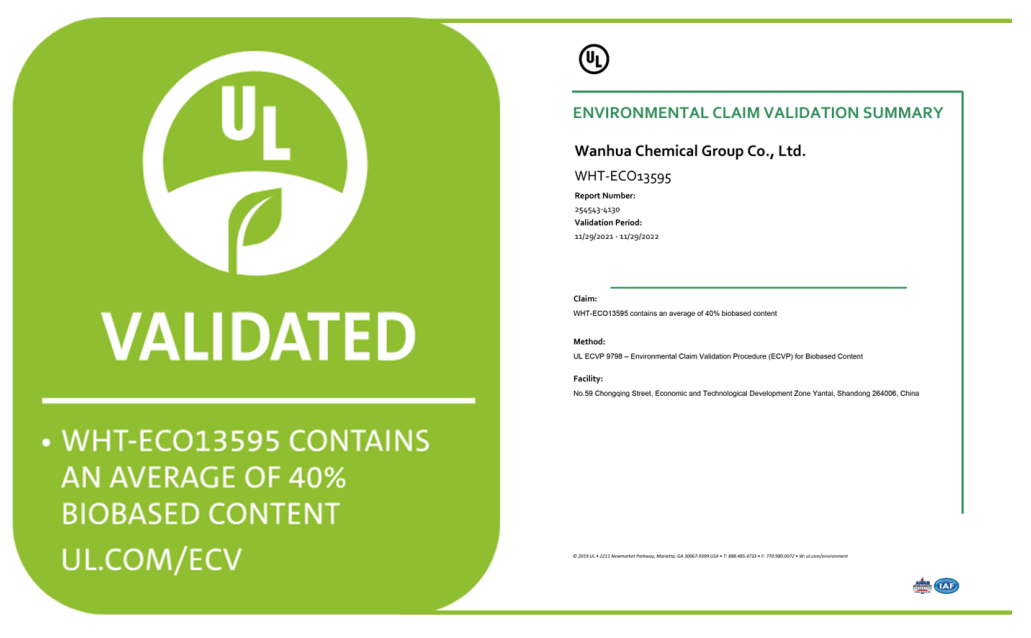 近日,万华化学生物基TPU产品WHT-ECO13595获颁UL绿色环境声明验证证书,这是业内首个获得UL认证的生物基TPU产品。该认证的取得,不仅彰显了万华化学生物基TPU产品的创新实力,更是对万华化学致力于推动全价值链低碳的高度认可。